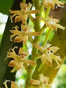 Tridactyle bicaudata is a species of flowering plant in the family Orchidaceae. This species can be found throughout most of Africa, from the Cape Province to Kenya and Ghana. It also can be found in a wide variety of different habitats, which makes it very amenable to cultivation. It has a monopodial growth habit, and can typically be found growing in clumps on rocks or on low lying tree branches. The flowers are canary yellow, 2 cm wide, and have a lip lobed into three sections. Two of the outlying lobes are fimbriated. Usually 8-16 flowers are born on an inflorescence, with multiple racemes possible resulting in a flower count in the thousands. The flowers form two rows on the single inflorescence. The species contains one subspecies, namely Tridactyle bicaudata subsp. rupestris.