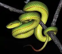 This snake was first discovered during a herpetological expedition in the summer of 2019 to the Eastern Himalayas in Arunachal Pradesh, India, which is a biodiversity hotspot and has a high degree of landscape heterogeneity with elevation ranging from 100 to 7000 m and distinct climatic regimes.[1][2] The expedition collected two specimens of a green pit viper of the genus Trimeresurus in the lowlands near Pakke Tiger Reserve, which were believed to be either Trimeresurus septentrionalis or Trimeresurus albolabris based upon their coloration and the number of dorsal scale rows. These specimens were later compared with eleven specimens of T. septentrionalis and T. albolabris from the collections of the Bombay Natural History Society, the Natural History Museum, London, National Museum of Natural History in Paris and the University of Copenhagen,[1] and differences were found in the coloration of the lateral stripe on the head and the body in males.[3] Molecular analysis of the genomic DNA confirmed that the specimens were a new species of green pit viper.[4] It became the fifth new reptile species to be discovered in Arunachal Pradesh in 2019.[5] The researchers also found two specimens of the new species in the Natural History Museum of Denmark which had been collected by a Danish naturalist, Bernt Wilhelm Westermann, between 1811 and 1816[6] but were wrongly labeled as white-lipped pit vipers.[7]