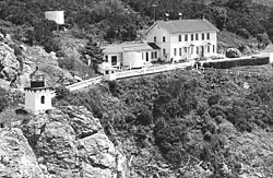 The low, square, brick tower, painted white, was built in 1871.[5] The light is only 20 feet (6.1 m) above ground, but the headland on which it stands gives it an elevation of 196 feet (60 m) above the sea.[4] Despite the great height above the sea, heavy seas have been known to reach it. A huge wave hit the lighthouse at about 4:40pm local time on the afternoon of 31 December 1913.[6] In 1914,[7] the keeper made the following report: