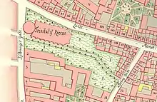 A cemetery was added on the church grounds as evidenced by Geddes' 1757 map of the neighborhood. After the Copenhagen Fire of 1795, which did not affect Trinitatis Church, a mandate for fire insurance was imposed. As the premium was substantial for the church's small resources, the church attorney, Nicolaj Christoffer Kall, suggested building shops on church property and renting them out to help increase revenues. The proposal was approved and construction began in 1798. Most of the cemetery north of the church was involved, and the shops were built along Købmagergade from the Round Tower to Landemærket, and further along Landemærket. Positioned on the south side of the church, features include a burial vault (1870) and granite tiles (1928-29).[10]