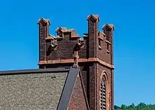 The church is a brick structure built in the Gothic Revival style.[1] The basement façade, copings, and trim are all made of Jacobsville Sandstone.[1] The building has a square tower at one corner capped with crenellations.[1]