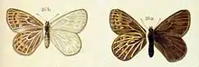 T. phryne Pall. (= tyrcis Cr.) (48 i) is blackish brown-grey, the wings of the male having a fine golden margin. Between the veins on the underside there is a row of submarginal ocelli , which in the female shine through above. From South-Eastern Russia through Transcaucasia, Armenia and Western Siberia to Kuldscha and the Altai. — In the form biocellata Stgr. two ocelli of the underside shine through above, where they sometimes appear as pupilled ocelli , and in striatula Elw. [var.] there are distinct light veins even on the upperside of the wings and the row of ocelli on the underside is surrounded with pale scaling and is thus placed in a kind of light band. — Nothing is known to me about the early life-history of Triphysa. They are insects of the steppes, where they appear in June and July, and are locally not rare. The females seem to fly very little, and are not even easily disturbed ; the males fly low down over the ground, probing one tuft of grass after another: when disturbed they fly up a few yards into the air but soon come down again to the ground.[4]