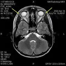 | MRI of the brain of 12-year-old boy with triple-A syndrome showing hypoplastic lacrimal glands (yellow arrows) | |