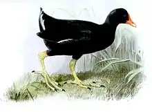 The Tristan moorhen (Gallinula nesiotis) is an extinct species of flightless rail endemic to the South Atlantic island of Tristan da Cunha.[2] It was very similar to the Gough moorhen of Gough Island, located 395 miles (636 km) to the southeast.