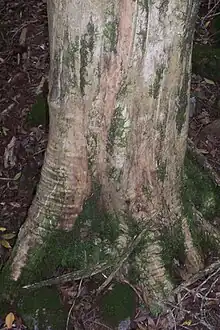 Tristaniopsis collina is a small to medium tree, up to 35 m (115 ft) in height and up to 75 cm (30 in) in trunk diameter. The trunk is irregular, not cylindrical. The bark is grey or creamy, very thin, with papery fibres that come off to touch. Branchlets are coloured purple and angular in cross section. The alternate simple leaves are around 5 to 8 cm (2 to 3 in) long, with a long thin tip, and numerous oil dots of varying sizes. The midrib is sunken on the top surface, but raised below.