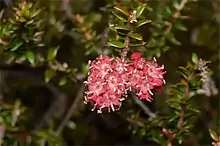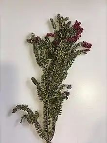 Mature plants form erect, bushy shrubs growing to around 1m in height. Leaves are small (2–4 mm long), densely-packed, ovate to elliptic in shape and are alternate in arrangement. The succulent leaves are dark green, with a red tinge around the margins and are slightly lighter green on the underside. Parallel venation is clear on the abaxial surface (underside) of the leaf which is a distinguishing characteristic of the Ericaceae family.[2] The tubular flowers possess 5 lobes, of about 4mm in length and range from pink to red in colour. Inflorescences form a dense cluster of drooping terminal spikes that are 1.5 cm long with the yellow filaments of the stamens being prominent sitting just outside of the floral tube.[3] Fruits are spherical, fleshy and present in a blue to purple/mauve colour at approximately 8 mm in diameter.[4] Fruits and flowers typically occur simultaneously, creating stunning displays of contrasting colours and textures alongside the neat foliage.[5]