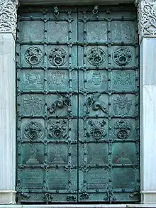 The famous doors of the main portal[1] were made by one of the most celebrated bronze-casters of the 12th century, Oderisio of Benevento; according to the inscription, they were finished in 1119. They contain 28 panels in niello work. The door knockers in the mouths of lions and the small figures of winged dragons, representing fear and desire[10] are the originals, little masterpieces of medieval sculpture.[9] Many of the panels were replaced during the 16th and 17th centuries, but the four along the top row are still the originals. They depict, from left to right: the artist, Oderisio; Christ in Judgment; Count Berard of Sangro; and Bishop William II. The inscription on the four panels below reads as follows:[11]