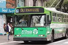 On 14 February 1958, at the intersection of 9 de Julio and Necochea streets, Dr. Isidoro Bousquet formally opened Mendoza's trolleybus system.[2] The first line to be put into service by the system's operator, the Empresa Provincial de Transportes de Mendoza (EPTM), was the "Parque" line, also known as line number 1. To this day, that line still follows the same route (9 de Julio, Colón, Arístides Villanueva, Boulogne Sur Mer, Jorge A. Calle, Perú and Godoy Cruz streets).[1] The system's second line, "Villa Nueva", opened in February 1959 and the third, "Dorrego", in March 1961.[3] Publicly, the routes were designated by names only, not numbers, and this practice continued until the mid-1990s and was revived in the 2010s.