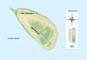 Tromelin is situated in the Mascarene Basin and is part of the Îles Éparses. It is currently only 7 m (23 ft) high.[3] It formed as a volcano,[4][5] now eroded, and developed an atoll ring of coral.[3]