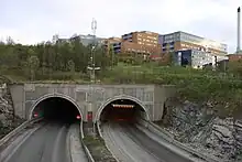 ![]() The tunnel entrance on the Tromsøya-side in Breivika with the University Hospital of North Norway seen in the background. | |
