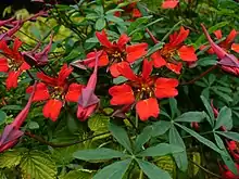 Tropaeolum speciosum, the flame flower or flame nasturtium,[1] is a species of flowering plant in the family Tropaeolaceae native to Chile, where it is known locally as coralito, quintralito, or voqui.[2]