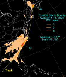 Bonnie triggered a tornado outbreak throughout portions of the Mid-Atlantic states. One tornado in Pender County, North Carolina destroyed 17 homes and damaged 59 houses, causing three deaths and $1.27 million in damage (2004 USD).[16] In Stella, Bonnie generated a waterspout that struck a campground, damaged nine trailers, and wrecked small boats.[17] A tornado in Richlands damaged several houses as well.[18] A suspected tornado in Danville, Virginia destroyed the roofs of several businesses.[14] In South Carolina, tornadoes across the state damaged nine homes. Also, rainfall peaking at 6.07 inches (154 mm) in Loris[5] caused flooding across the state. The flooding, including a one-foot depth along U.S. Route 501, washed away a road and a bridge in Greenville County. In addition, 600 people across the state were left without electricity.[19]