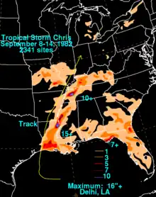 - 1 2 3 4 5 6 7 8 David M. Roth (2007-05-16). "Tropical Storm Chris - September 8-14, 1982". Hydrometeorological Prediction Center. Retrieved 2012-01-01.
