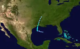 In post-season analysis, it was indicated that Tropical Depression Four strengthened into Tropical Storm Chris at 1200 UTC on September 10. Due to a large low pressure trough over the Southwestern United States, Chris immediately curved northward.[1] Later that day, the National Hurricane Center noted that "even though conditions do not favor rapid strengthening...winds could approach hurricane force before the center moves inland Saturday".[3] As it approached closer to the Gulf Coast of the United States, Chris curved slightly east of north. Shortly before 1200 UTC, Chris made landfall near Sabine Pass, Port Arthur, Texas, with winds of 65 mph (100 km/h). At 1200 UTC on September 11, Chris attained its peak intensity with winds of 65 mph (100 km/h) and a minimum pressure of 994 mbar (29.4 inHg). Chris weakened quickly, and was downgraded to a tropical depression by early on September 12 while centered over west-central Louisiana. The storm deteriorated further, and dissipated in Arkansas at 0000 UTC on September 13. The remnants were last noted over the Midwestern United States.[1]