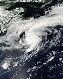 ![]() Tropical Storm Cristobal shortly after peak intensity south of Nova Scotia on July 22 | |
