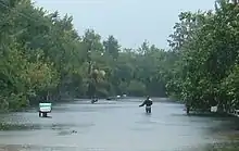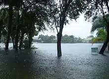 Areas of the state received up to 25 inches (64 cm) of rain, causing serious flooding. Native wildlife, including alligators, were seen in flooded neighborhoods after high water forced them from their habitat. Hundreds of homes were flooded in Brevard and St. Lucie counties; some locations were inundated with up to 5 feet (1.5 m) of standing water.[62] Early estimates from Brevard county show $10 to $12 million in damages to homes and infrastructure.[59] Tropical Storm Fay resulted in the drowning of one person swimming off Neptune Beach and another swimmer in Duval County. Meanwhile, another 3 were killed in traffic accidents.[63] On August 21, President George W. Bush declared the entire state of Florida a Federal Disaster Area.[64] Seminole County also got hard hit by floods. Seminole County Public Schools were closed due to many roads being impassable. Many rivers in the county such as the St. Johns River, the Econlockhatchee River, and the Little Econlockhatchee River jumped their banks. Riverside Park in Oviedo was under four feet of flood water due to the Little Econlockhatchee River. On the evening of August 22, a tornado damaged four homes and a bridge in Lake Wales.[65]