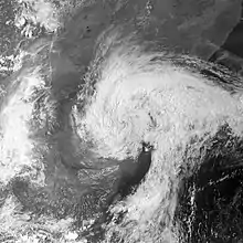 Late on June 24, Tropical Storm Meari is estimated to have attained its peak intensity with winds around 110 km/h (70 mph) and a barometric pressure of 975 mbar (hPa; 28.79 inHg).[3] Situated northeast of Taiwan, the storm turned northward due to a blocking ridge over Manchuria, China.[10] By this time, the storm moved out of PAGASA's area of responsibility and the agency issued their final advisory.[11] Throughout June 25, Meari's structure rapidly degraded as an approaching trough produced major subsidence over the northwestern portion of the storm.[12] Situated between a subtropical ridge to the east and a trough to the west, the storm rapidly accelerated northward towards the Korean Peninsula. During this time, the system crossed over significantly cooler waters and alongside the subsidence, convection struggled to develop.[13] Once over the East China Sea on June 26, the vertical structure of Meari significantly degraded, leaving only a surface low. In light of this, the storm turned back towards the northwest, again threatening China.[14] Void of convection due to shear from the mid-latitude Westerlies, the weakened system soon made landfall along the Shandong Peninsula.[15] After remaining near the peninsula for several hours, Meari rapidly accelerated towards the northeast and began taking on characteristics of an extratropical cyclone.[16] Early on June 27, the storm completed the transition into an extratropical system hours before striking North Korea near the city of Anju with winds of 85 km/h (50 mph). Hours after moving onshore, the storm rapidly dissipated and was last noted around 1200 UTC.[3]