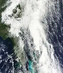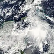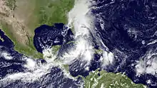 In late September 2010, a wide band of disturbed weather and low pressure, associated with the monsoon trough and remnant tropical moisture from Tropical Storm Matthew, meandered over the northwestern Caribbean Sea.[3] With a broad upper ridge anchored along the Yucatán coast, diffluence aloft in the vicinity of the disturbance provided focus for the development of scattered convection.[4] The National Hurricane Center (NHC) noted an environment supportive of tropical development, and by September 27, a broad surface low formed amid the convection.[5] The next day, surface pressures steadily dropped as sustained winds around the low proximated tropical storm force.[6] Throughout the development process, moderate westerly wind shear over the region caused the disturbance to exhibit a rather asymmetric structure;[1] it developed an elongated low-pressure center by September 28, well to the northwest of its strongest wind field.[7] Despite the asymmetry, the NHC initiated advisories on a tropical depression around 15:00 UTC that day, after surface and satellite observations revealed a sufficiently defined circulation center west of the deep convection.[8] Post-season reassessments, however, indicated that a tropical storm had, in fact, formed three hours earlier, about 75 miles (120 km) south of Cuba's Isle of Youth, which operationally was not named Nicole until a day later.[1][9]