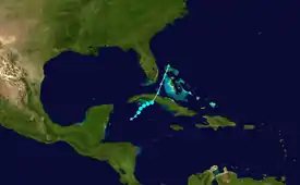 In anticipation of a tropical storm, warnings were issued for the Cayman Islands, the northwestern and central Bahamas, and the Cuban provinces of Matanzas, Cienfuegos, Villa Clara, Sancti Spíritus, and Ciego de Ávila on September 28.[16] However, the warnings were discontinued the following day after reports of the storm's prompt dissipation.[17] After forecasters warned of severe weather across the Cayman Islands, schools and government offices closed in low-lying areas,[18] and emergency teams cleaned out storm drains and readied shelters.[19] Thunderstorms in Grand Cayman forced Cayman Airways to cancel all express flights to Cayman Brac and Little Cayman on October 29; weather-resistant jet service was provided to stranded passengers.[18] A marine warning was required for all three islands due to rough sea conditions.[20][21]