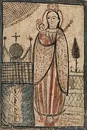 Nuestra Señora del Rosario is also the name of the early nineteenth-century church in the center of the village. The church contains two large altar-screens (reredos) by the renowned santero Pedro Antonio Fresquis. One screen is dated 1821, and there are other fine examples of early nineteenth-century santero art in the church.[4]