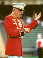 Due to his reputation and popularity in the drum corps world, in 1966, Crawford was asked to join the United States Marine Drum and Bugle Corps as chief musical arranger.[2] Reentering the service as an enlisted man, he was later commissioned as a lieutenant and became commander of the drum corps.[5] During his thirty-year career in the United States Marine Corps, Crawford rose to the rank of colonel and was decorated with the Legion of Merit, the Navy Commendation Medal, and the Meritorious Service Medal among other honors. As he had done with the Air Force corps, Crawford made the Marine Corps corps into a smoothly swinging contemporary musical group. The Commandant's Own, under his direction, performed at the historic 1978 Camp David meeting of Egyptian President Anwar Sadat and Israeli Prime Minister Menachim Begin, causing Begin to comment, "What a marvelous art form."[6] At the time of his retirement in 1996, Col. Crawford was the oldest Marine on active duty.[2]