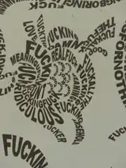 His wallpaper art creates large-scale wallpaper installations that evoke the floral designs of William Morris in a style that has become known as word-art installation.[2] It combines foul language with floral patterns (the text is arranged to form flowers and plants), highlighting the organic force intertwining nature and human; the surface being the text and the attached emotions as shouts to be discovered by the visitor.[3]