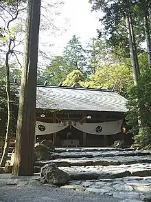 The origins of Tsubaki Grand Shrine are unknown. Although there is no documentary evidence, the shrine's legend states that it was founded in the year 3 BCE[2] during the reign of the legendary Emperor Suinin by the order of Princess Yamato on the site of the grave of Sarutahiko. It first appears in historical documentation in an entry dated 748 in the Daianji garan engi nami rukishizaichō (大安寺伽藍縁起並流記資財帳) records of Daian-ji in Nara. It is listed as a major shrine in the Engishiki records from the early Heian period, and was regarded as the ichinomiya of the province from this time, although this is contested by Tsubaki Jinja, (also in Suzuka), which claims that it is the shrine listed in the Engishiki.[3]