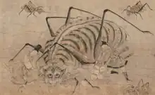 Raikō and Tsuna follow the trail of blood until it leads them to a cave in Nishiyama (ja).[10] At the entrance to the cave, Raikō, looking at his broken sword, is reminded of the tale of Mikenjaku of the kingdom of Chu, who took a broken sword and struck down the king.[19] He crafts an effigy out of his broken sword and heads into the cave.[20] Before long, the two companions encounter an enormous beast some 20 jō, or around 60 metres, in length, with bright, shining eyes.[20] The tip of Raikō's sword shoots out of the shadows and collapses the effigy,[20] and after a struggle, in which Raikō calls on divine aid from Amaterasu, the sun goddess, and Shō Hachimangū, his family's patron,[21] they eventually manage to bring down the creature—a yamagumo ("mountain spider").[22] As swift as lightning, Raikō decapitates the beast with his broken sword,[23] and Tsuna goes for the belly, where he finds that it is already cut open—Raikō's handiwork from their previous encounter at the old house.[23] Out from this pour some 1,900 skulls,[22] cutting open its side causes a large number of smaller spiders, each around the size of a human child, to emerge, and digging around in its stomach they find about twenty more very small skulls.[23] The two dig a grave and bury the skulls,[23] before setting fire to the manor that had housed the monstrous spider.[22]