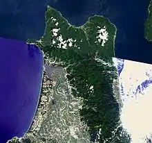 The Tsugaru Peninsula (津軽半島, Tsugaru Hantō) is a peninsula in Aomori Prefecture, at the northern end of Honshū island, Japan. The peninsula projects north into the Tsugaru Strait separating Honshū from Hokkaidō. The western coast is on the Sea of Japan, while on its eastern coast are Aomori Bay and Mutsu Bay. The peninsula is bisected from Cape Tappi at its northern end to the Hakkōda Mountains on its southern end by the Tsugaru Mountains. Across the Tsugaru strait to the north is Hokkaidō's Matsumae Peninsula, to which it is linked by the Seikan Tunnel.[1][2]