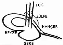 The vertical lines on the top of the tughra are called tuğ, or flagstaff. The three tugs signify independence. The S-shaped lines crossing the tugs are called zülfe and they, together with the tops of the tugs that also look to the right, signify that the winds blow from the east to the west, the traditional movement of the Ottomans.