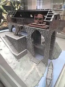 Tub boat lifts consisted of a moveable hoist travelling on four toothed wheels engaging with two toothed wooden rails, one mounted on each supporting wall. The hoist possessed two drums around which the lifting cables were wound. The lifting ropes passed through pulley blocks before being attached to lifting eyes on the boats to make the lift easier. Four men would wind the hoist when lifting a full 2.5 to 3 tonne tub boat until it was high enough to pass over the dam of the upper canal.