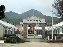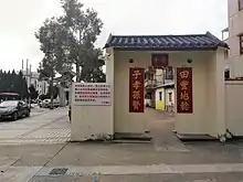 The wall of Tuen Tsz Wai was rebuilt in 1978. The entrance gate of the walled village, originally at the southern end of the central axis, was demolished and a new one was built further east, at the location of a former watchtower. A new permanently closed gate was rebuilt on the site of the former entrance gate as a memorial. The move and reconstruction of the entrance gate are the consequence of the establishment of the Miu Fat Monastery: having a monastery face directly the entrance of a village is considered to have a negative influence on its feng shui.[3][7] The former name of the village, "Tin Tsz Wai" (田子圍) is still inscribed on the former gate. A shrine is located at the northern end of the central axis. It was rebuilt in 1983.[7]