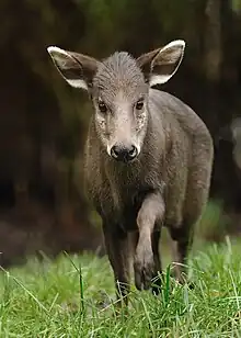 The tufted deer (Elaphodus cephalophus) is a small species of deer characterized by a prominent tuft of black hair on its forehead and fang-like canines for the males.[2] It is a close relative of the muntjac, living somewhat further north over a wide area of central China and northeastern Myanmar. Suffering from overhunting and habitat loss, this deer is considered near-threatened. It is the only member of the genus Elaphodus.