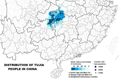 (Only includes counties or county-equivalents containing >0.5% of China's Tujia population.)