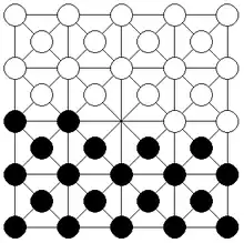 - Each player's 20 pieces are set up on his or her half of the board on the intersection points including the middle (fifth) rank, specifically the two intersection points to the left of the middle point. The middle point is the only intersection point left vacant in the beginning.[2]