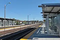 Construction of the permanent station was pushed back into 2013 to allow for further design development.[4] The $17 million construction contract was awarded to Absher Construction in April 2013,[60] and a ceremonial groundbreaking was held on June 24, 2013.[61][62] The west platform was demolished in August and replaced with a temporary platform to serve Sounder and Amtrak trains.[63] In June 2014, the RapidRide F Line began serving the station's newly completed bus bays, replacing local service on routes 110 and 140 between Burien and Renton.[64] The City of Renton completed its extension of Strander Boulevard to the station later in the month, connecting to the new park and ride on the west side of the platforms.[5][65][66] Following a four-week closure of the east platform,[67] both permanent platforms were re-opened in August 2014.[68] Construction of the permanent station reached substantial completion in December,[65] and the new station was dedicated by local dignitaries on February 18, 2015.[2][69] The east platform was built with additional width to be removed for a third track,[68] which was installed by BNSF in 2016.[70]