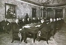 In front of President L. K. Relander, Kyösti Kallio was the first behind the table, Antti Tulenheimo was in front of the table