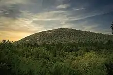 The mountain actually has twin "peaks" topographically, having a smaller 856-ft elevation to its south, near Fryeville Road, Mayo Road, and Tully Pond, which is sometimes referred to as Little Tully Mountain.[3] Little Tully Mountain is clearly visible from Tully Mountain, but is seldom climbed as it is forested.
