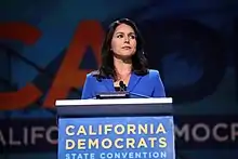 In 2002, Gabbard was elected to the Hawaii House of Representatives at the age of 21.[5] Gabbard served in a field medical unit of the Hawaii Army National Guard while deployed to Iraq from 2004 to 2005 and was stationed in Kuwait from 2008 to 2009 as an Army Military Police platoon leader.[6][7][8] While a member of Congress, she served as a vice chair of the Democratic National Committee (DNC) from 2013 to 2016, and resigned to endorse Bernie Sanders' campaign for the 2016 Democratic presidential nomination.