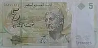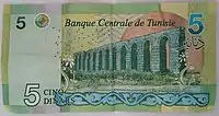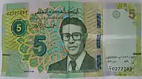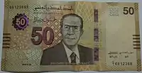After the fall of the Ben Ali regime in Tunisia, a new set of banknotes was issued progressively, with a redesigned 20-dinar note issued in 2017 and a redesigned 10-dinar note issued in 2020. As of 2020, the 20 and 50 dinar notes issued 2011 and the 5 and 10 dinar notes issued 2013 are in use as well as the new series. At that time, 50 dinar notes were withdrawn when sent to the Central Bank in the course of their circulation while a new design hadn't been confirmed yet.[7] In 2022, new banknotes of 5 and 50 dinars were introduced.[8][9]