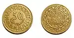 On 3 November 1958, banknotes were introduced by the Central Bank of Tunisia in denominations of 12, 1 and 5 dinars.[4] The designs of these denominations were changed with a series of notes dated 1-6-1965, but issued on 3 March 1966. A 10-dinar note dated 1-6-1969 was issued on 2 January 1970. The last 12-dinar notes were dated 1973-10-15 whilst the last 1-dinar notes were dated 1980-10-15. 20-dinar notes dated 1980-10-15 were introduced on 26 December 1984. 30-dinar notes were issued between 1997 and 2011. 50-dinar notes dated 2008 were issued on 25 July 2009.[5] On 8 November 2005, an updated version of the frequently used 10-dinar note was issued.