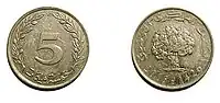 In 1960, aluminium 1, 2 and 5 millime and brass 10, 20, 50 and 100 millime coins were introduced. The 1 and 2 millimes were last issued in 1990 and 1983 respectively, and are no longer legal tender. In 1968, nickel 12 dinar coins were introduced, replaced by smaller, cupro-nickel pieces in 1976, when cupro-nickel 1 dinar coins were also introduced. Bimetallic 5 dinar coins were introduced in 2002.