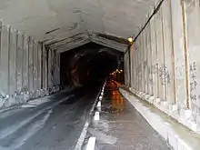 The humid conditions in the tunnels meant that ordinary corrugated iron corroded extremely rapidly, so the buildings within the tunnels were constructed using iron sheeting that had been coated in bitumen.[19] A gap of 2 feet (0.61 m) was left between the buildings and the rock walls to enable ventilation and drainage and to facilitate inspections of the rock.[18] Power was provided by four electrical power stations with a total installed load of 1,200 kW; water, electricity and oil were channelled via pipes and cables fixed to the tunnel walls, with drainage pipes running along the floors. The ventilation was provided by natural currents of air.[19]