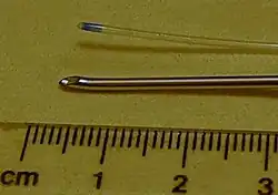 A 16G Portex Tuohy needle and epidural catheter. Large rule marks 1 cm apart.