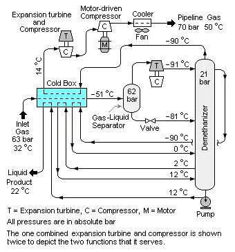 The gas stream from the gas–liquid separator enters the turboexpander, where it undergoes an isentropic expansion from an absolute pressure of 62 bar to 21 bar (6.2 to 2.1 MPa) that lowers the gas stream temperature from about −51 °C to about −91 °C as it enters the demethanizer to serve as distillation reflux.