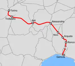 The Turin–Genoa railway line is a major Italian rail line, connecting the cities of Turin and Genoa. It is 169 kilometres (105 mi) long.