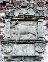 On the east side of the castle, a stone slab adorns the "ox tower." The inscription grasped early days of the castle. The coat-of-arms and the bison are engraved next to the text, that was gilded once upon a time. The inscription announced: