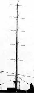A later innovation involved changing the shape of the dipole elements, from simple rods to broader shapes, to increase the bandwidth of the antenna.[7] Early TV broadcast antennas used "cigar shaped" elements, shown in image of 1939 RCA Empire State Building antenna above. A common shape today is the batwing or superturnstile antenna, used for television broadcasting in the VHF or UHF bands[8] The batwing shape of each element produces an antenna with wide impedance bandwidth.[1] Up to eight batwing antennas are usually stacked vertically and fed in phase to make a high gain omnidirectional antenna for TV broadcasting.[3][1] The wide bandwidth was needed at the low VHF analog TV broadcast band, as the 6 MHz TV channel bandwidth was about 10% of the frequency.[1]