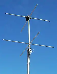 A turnstile antenna, or crossed-dipole antenna,[1] is a radio antenna consisting of a set of two identical dipole antennas mounted at right angles to each other and fed in phase quadrature; the two currents applied to the dipoles are 90° out of phase.[2][3] The name reflects the notion the antenna looks like a turnstile when mounted horizontally. The antenna can be used in two possible modes. In normal mode the antenna radiates horizontally polarized radio waves perpendicular to its axis. In axial mode the antenna radiates circularly polarized radiation along its axis.