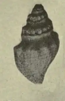(Original description) The small and solid shell contains five and one-half whorls, each of which is sharply angulated. The spire has about same length as the body of whorl. The body whorl is sculptured with nine distinct revolving ribs below the angle and within the interspaces there is a fine revolving thread. Between the last upper revolving rib and the angulated portion of the whorl there are five closely set very inconspicuous revolving threads . Between the angle and suture there are ten similar lines. This ornamentation is crossed by numerous closely set lines of growth which conform to the slightly developed posterior sinus. On the angle of each whorl there are thirteen prominent nodes which disappear above and below. The aperture is moderately wide. The outer lip is sharp. The inner lip is slightly callused. The siphonal canal is slightly extended with a well defined sinus at the end. The upper margin of each whorl is developed into a collar which partly covers the suture. The angle of the body whorl is very close to the suture. [1]